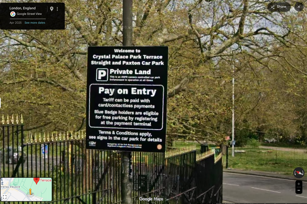 Crystal Palace Park is owned by the Greater London Authority and is managed and controlled pursuant to statutory powers conferred by the London Parks and Open Spaces Act 1967, as confirmed by the Ministry of Housing and Local Government Provisional Order Confirmation (Greater London Parks and Open Spaces) Act 1967, and is further regulated by specific Crystal Palace Park Byelaws made under, inter alia, the Public Health Acts Amendment Act 1907 and the Local Government Act 1972. In consequence, parking and use of vehicles within the park is subject to a statutory regime and is not merely a matter of private contract on ordinary private land.