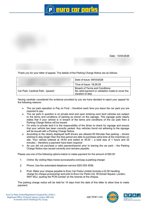 Euro Car Parks POPLA Appeal