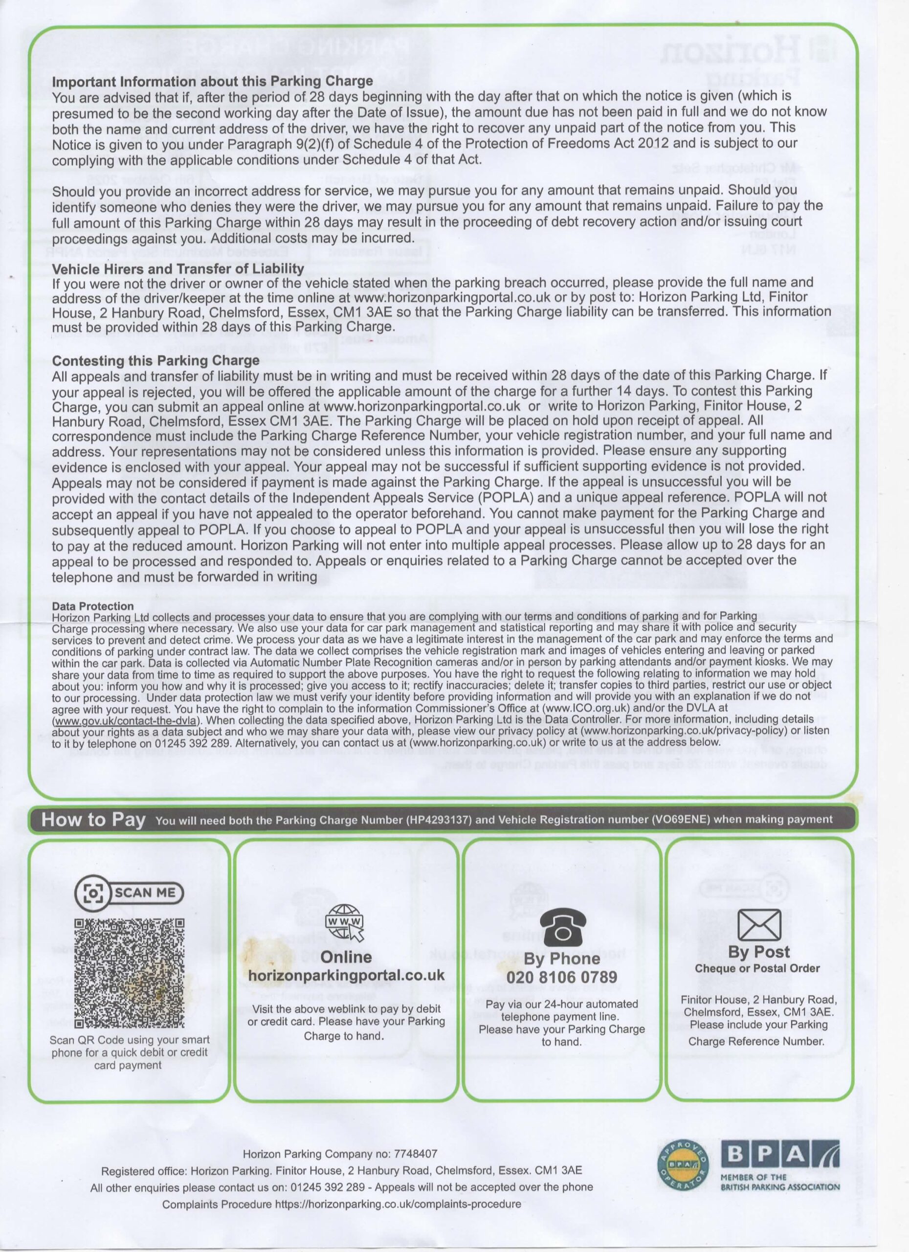 Alternatively, payment can be made via cheque made payable to Horizon Parking Ltd and posted to Horizon Parking Ltd, Finitor House, 2 Hanbury Road, Chelmsford, Essex, CM1 3AE.