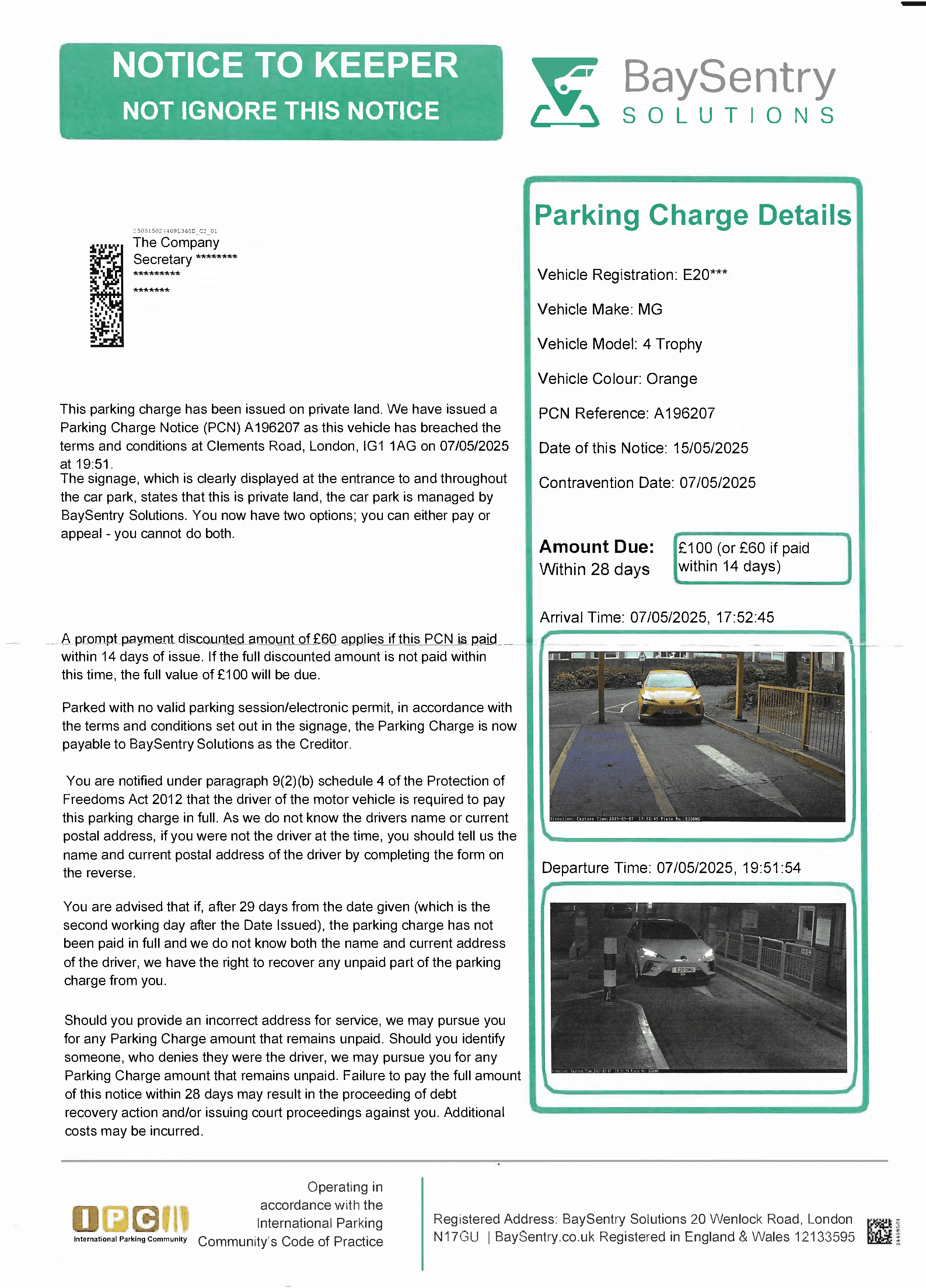In addition, the signage does not identify BaySentry as the parking operator. The sign only refers to CitiPark, with no mention of BaySentry at all. Clause 3.1.3(c) of the Private Parking Single Code of Practice requires that the name and contact details of the parking operator must be included on signage that sets out the terms and conditions. This omission is significant. A contract cannot be formed if the other party is not clearly identified. This casts doubt on whether BaySentry has any contractual authority to issue this Parking Charge Notice.