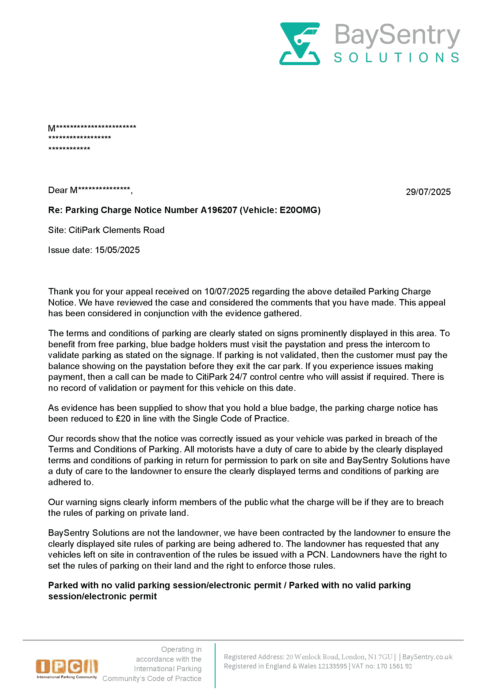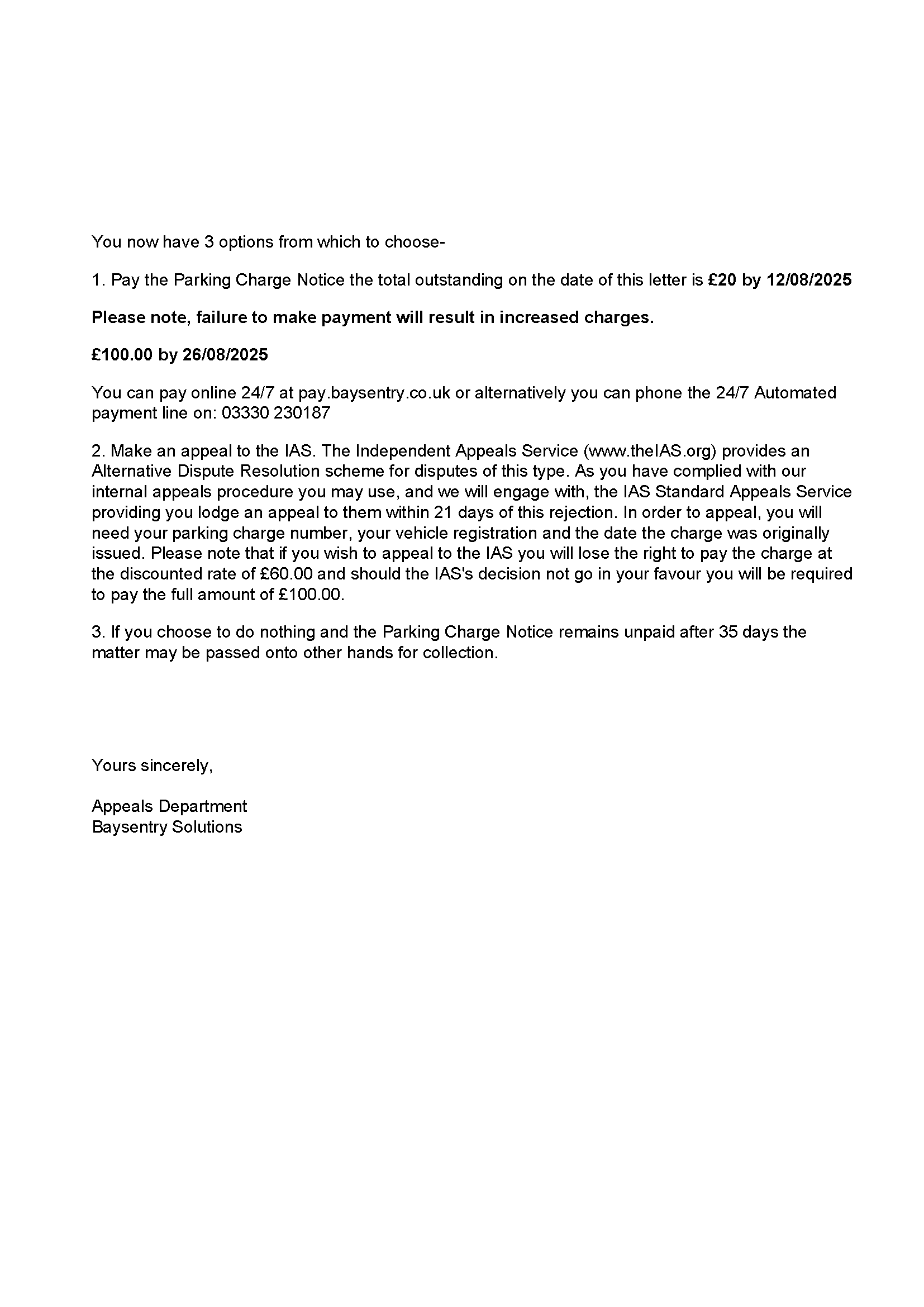5. Because BaySentry is a member of the IPC, not the BPA, you will not be able to appeal to POPLA. Instead, they will direct you to the so-called Independent Appeals Service (IAS). However, the IAS is not a statutory or genuinely independent body. It is funded by the IPC and overwhelmingly finds in favour of operators. Submitting an appeal to the IAS is widely regarded as an exercise in futility. You should expect that any initial appeal to BaySentry will be rejected, and any attempt to appeal to the IAS will be unsuccessful, no matter how strong your arguments are.