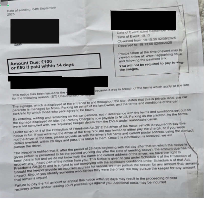 I am after a bit of advice. Today i received a letter from NSGL demanding £100 as the registered keeper of a vehicle that was parked on a road inside a huge business park. the vehicle was parked on a road with no yellow lines and no immediately visible no parking signs. The letter states that the whole of the business park is private and therefore a ticket has been issued.
