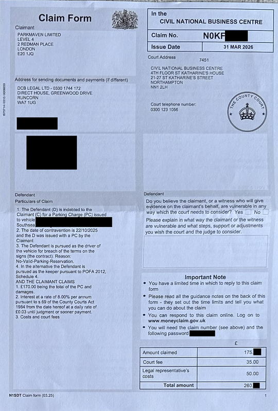 Author Topic: ParkMaven - CCJ Claim Form issued as first contact - Private parking in front of Business  (Read 30 times)