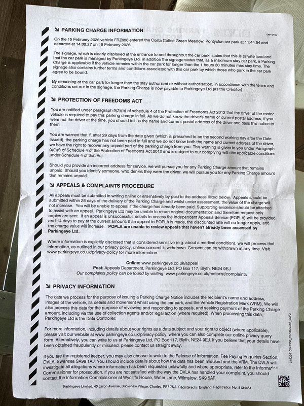 On 15th Feb the driver drove into the Costa Coffee, Pontyclun car park, found a parking space and entered the coffee shop with two friends. No parking signs were noticed by this group, and they weren’t advised of any parking restriction by staff of the coffee shop. The group left the coffee shop more than two hours later and drove away.