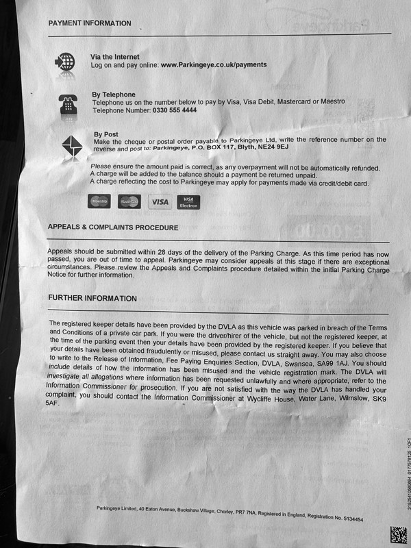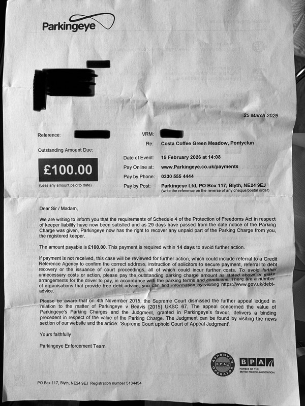 On 2nd April I received a letter from the parking company dated 25 March stating that Schedule 4 of PFA has been satisfied and as 29 days have passed from the date the PCN was given parkingeye has the right to recover the parking charge from me.