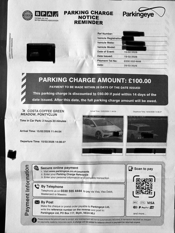 The PCN reminder and Schedule 4 letter are included below. I have the number of the Costa area manager and Will phone her tomorrow and ask that this be cancelled, however as this was promised but didn’t happen previously I’d be grateful for suggestions as to my next steps.
