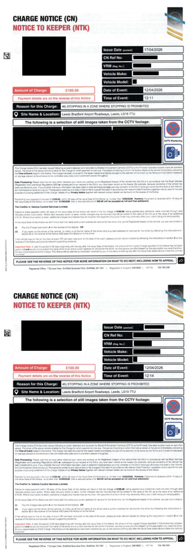 I’ve just received 2 separate Charge Notice from Vehicle Control Services for “stopping in a zone where stopping is prohibited” at Leeds Bradford Airport in the space of 3 minutes.